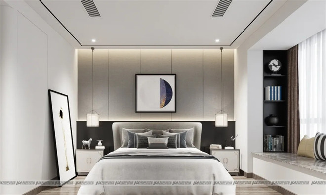 相比於主臥的沉穩(wěn)儒雅,次臥更淡然素凈,靜謐的灰是空間的主調(diào),與自然紋路的木地板一呼一應,烘托出臥室的恬靜溫馨,床頭兩盞對稱的吊燈透出柔和的光芒,藝術擺件點綴空間,環(huán)環(huán)相扣,東方遇上現(xiàn)代,恰到好處地演繹出現(xiàn)代中式美學。