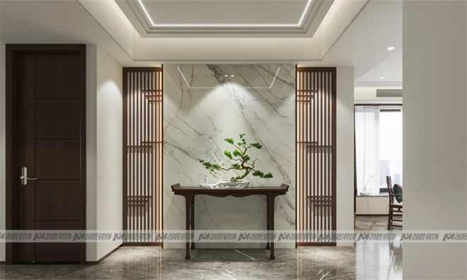 將中國文化延伸到家居文化當中,既符合現(xiàn)代審美又保留東方美學及其文化精髓。原木柵欄的玄關,線條簡潔利落,佈局對稱端莊,在整片的大理石背景墻襯托下,意境雅緻優(yōu)美,靜謐空靈。