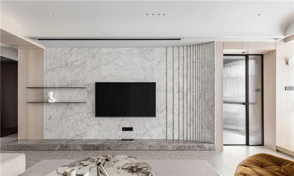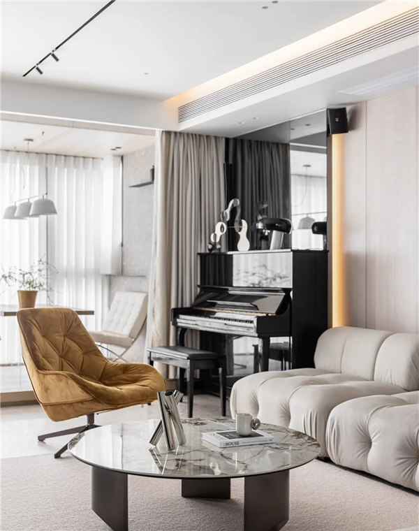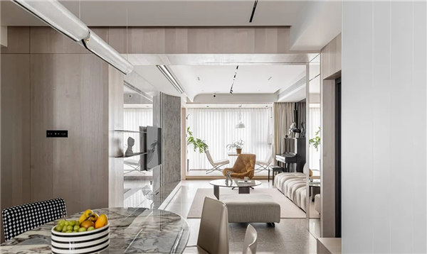 全屋采用無主燈和局部線性燈光設計,營造放松、溫馨氛圍,整體以白色、淺色的木飾面為主,搭配小面積的鏡面穿插,融合自然紋理的石材點綴,通過對材質、細節的整合把控,進一步達到對空間本身的塑造以讓心靈找到歸屬